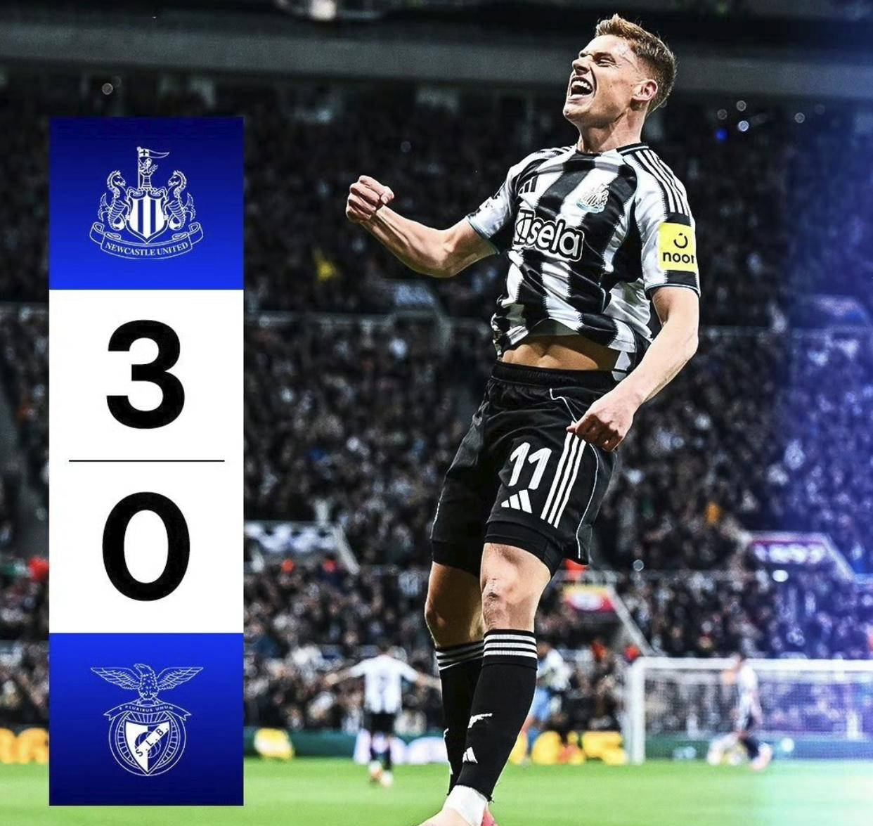 在当天的比赛中,本菲卡客场遭遇溃败。面对纽卡斯尔的比赛中,本菲卡射门次数7次对19次落后,射正2-10,射门效果差距为1-5,完全被对手压制。最终,在戈登和替补球员巴恩斯的表现下,纽卡以3-0击败本菲卡。本赛季欧冠中,纽卡斯尔取得2胜1负,暂列积分榜第七位;而本菲卡则难求一胜。